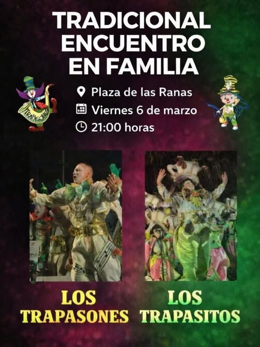 A partir de las 21:00 horas, el público podrá vivir una noche cargada de música, humor, colorido y emoción con la presentación de las reconocidas agrupaciones Los Trapasones y Los Trapasitos, exponentes del espíritu carnavalero que año tras año convocan a multitudes con su puesta en escena, vestuarios llamativos y un repertorio que combina crítica, alegría y tradición popular.