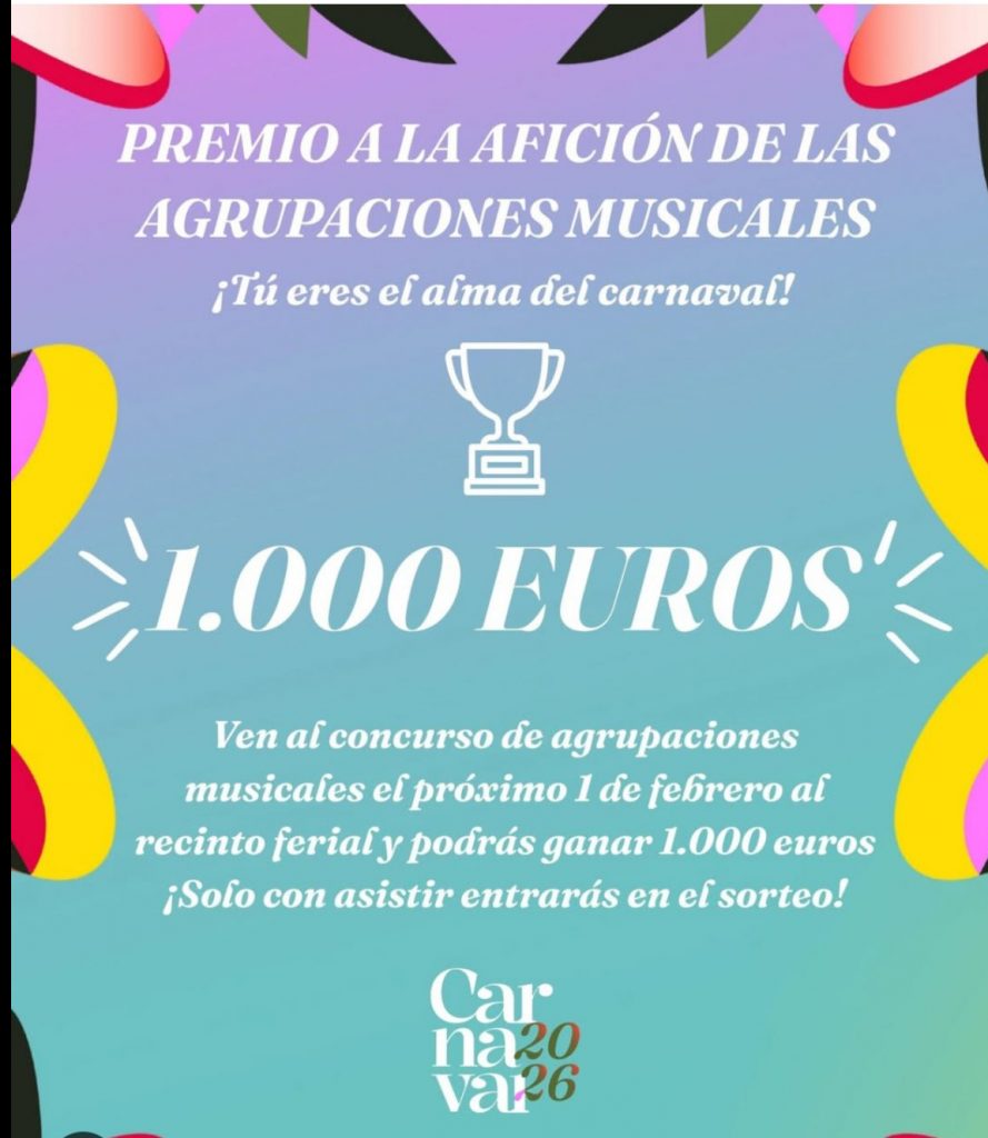 La Federación de Agrupaciones Musicales ha anunciado la celebración del Premio a la Afición, una iniciativa que busca reconocer y premiar la implicación del público en una de las citas más esperadas del calendario carnavalesco. El evento tendrá lugar el próximo 1 de febrero en el Recinto Ferial, con la promesa de música, ambiente festivo y la posibilidad de ganar 1.000 euros.