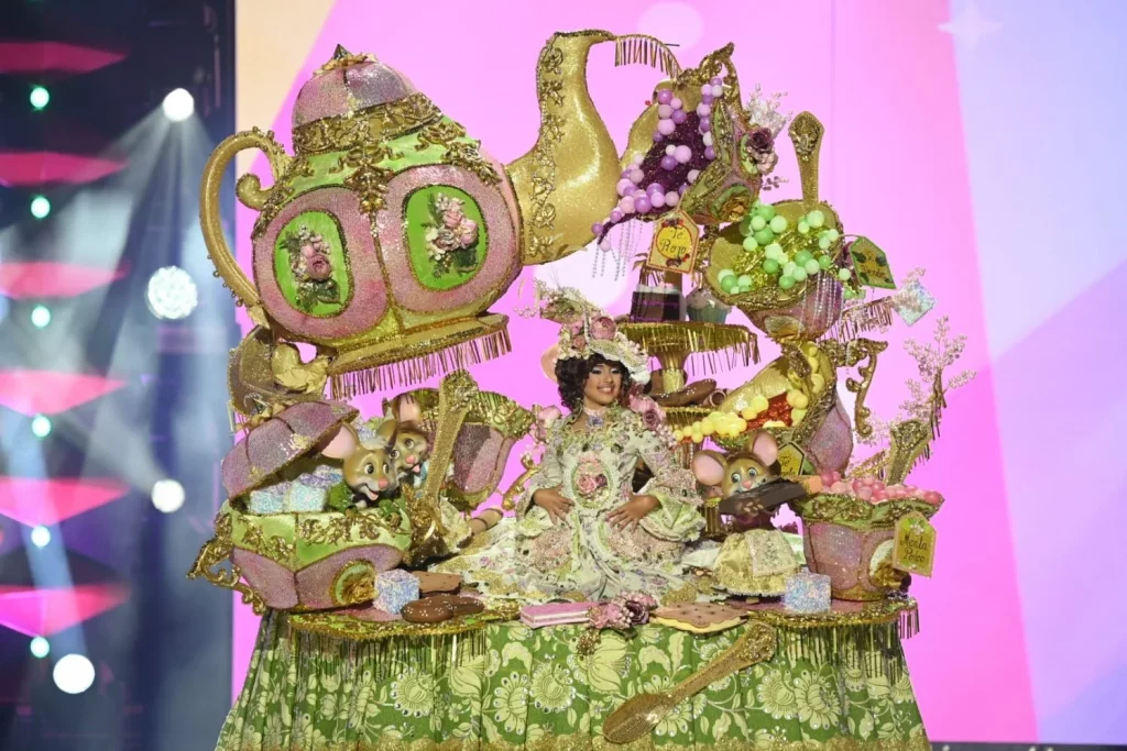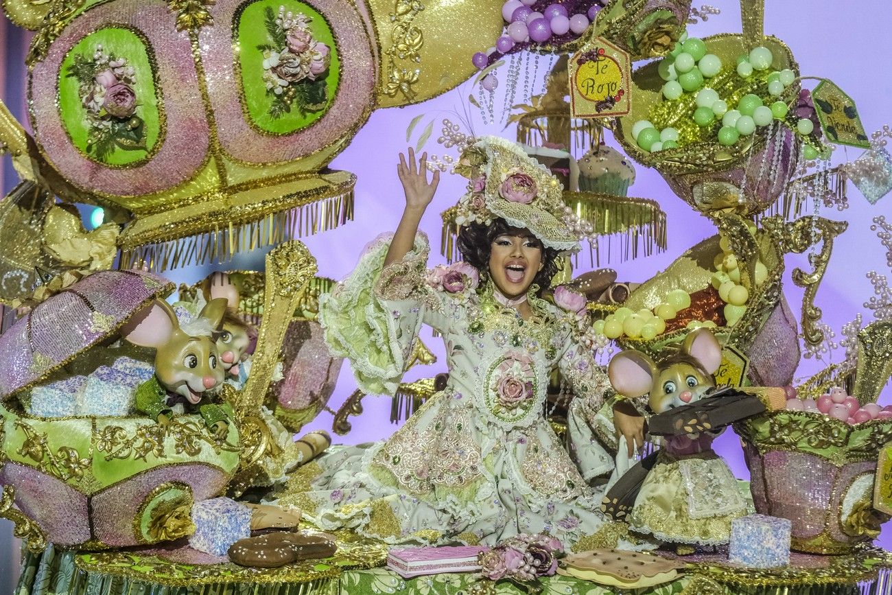 El Carnaval que celebra 50 años ya ha coronado a su primera reina, la infantil. Elena Henríquez González con la fantasía «Té, estaba esperando», un trabajo de Masbe Creaciones para la Asociación Cultural Adasat ha sido la primera en ascender al trono del Carnaval de «Las Vegas». Su elegante diseño en dorados, rosas y verdes invita a singulares compañeros a una merienda especial en la que, sin duda, celebrará su título.