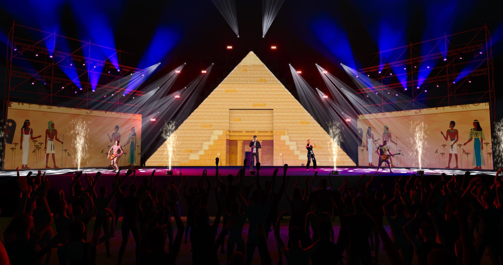 El elemento más destacado del diseño será sin duda una espectacular pirámide de luces LED de 96 metros cuadrados que presidirá el espacio. El escenario contará además con 200 metros cuadrados de pantallas LED con una resolución de 10k y hasta 94 focos de luces móviles que permitirán todo tipo de efectos y aportarán aún más espectacularidad.