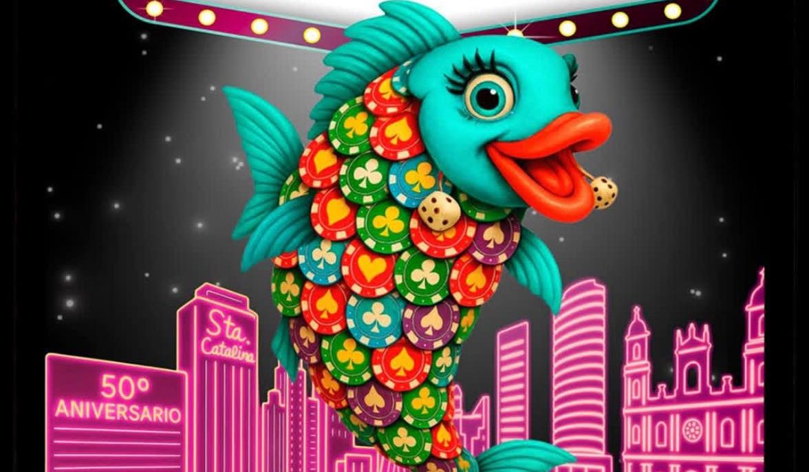 • Néstor Santana presentó un cartel reivindicativo: el carnaval pertenece a la noche y a las calles. Su propuesta incluye una sardina cuyas escamas son fichas de póker y referencias arquitectónicas de la ciudad.