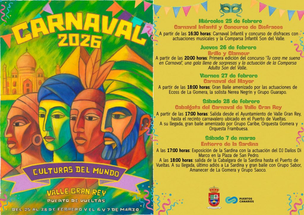 El Ayuntamiento de Valle Gran Rey ha presentado hoy la programación del Carnaval 2026, que este año se desarrollará bajo la temática “Culturas del Mundo”, ofreciendo una agenda variada de actividades pensadas para el disfrute de vecinos, vecinas y visitantes.